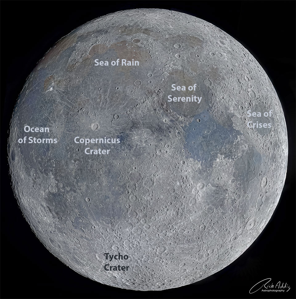 ¿Qué hay de diferente acerca de esta Luna? Son los terminadores. En la imagen presentada acá, Ud. no puede ver directamente algún terminador — la línea que divide la luz de día de la oscuridad de la noche. Eso es porque la imagen mostrada es una composición digital de muchas tiras cercanas al terminador lunar sobre una Luna llena. Las regiones del terminador muestran las sombras más largas y más prominentes — sombras las cuales, por su contraste y longitud, permiten a una fotografía plana aparecer como tridimensional. Las imágenes sobrepuestas fueron tomadas a lo largo de dos semanas a principios de abril. Muchos de los cráteres de la Luna resaltan debido a las sombras que todos arrojan hacia la derecha. La imagen muestra en detalle gráfico que la regiones más oscuras conocidas como maria no sólo son más oscuras que el resto de la Luna, también son más planas.