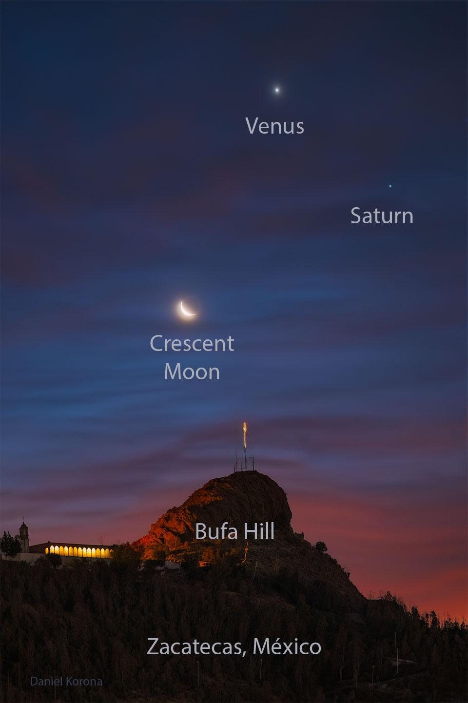 Algunas veces, el cielo mismo parece sonreír. Hace unos cuantos días, visible desde muchas partes del mundo, una superposición inusual de nuestra Luna con los planetas Venus y Saturno creó tal icónica expresión facial. Específicamente, una Luna menguante pareció hacer una cara feliz en el cielo nocturno cuando se emparejó con planetas aparentemente cercanos entre sí. Fotografiada acá está la escena que apareció sobre Zacatecas, México, con la distintiva Colina Bufa en el primer plano. En el extremo derecho y el más lejano en distancia está el planeta Saturno. Significativamente más cercano y visible arriba a la izquierda de Saturno está Venus, el planeta más brillante del cielo. Justo encima del horizonte central está la Luna de la Tierra en una fase menguante. Para crear este gigantesco ícono, la fase de la Luna debe estar en la dirección correcta de la sonrisa.
