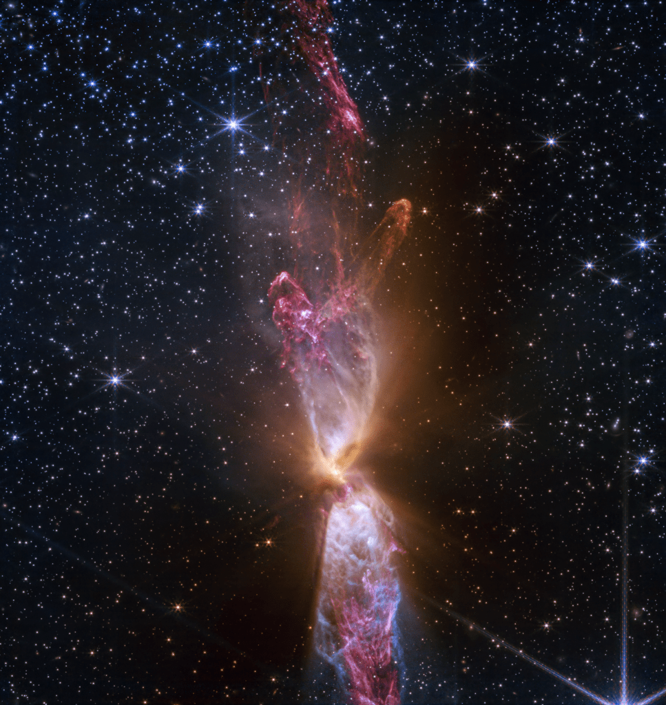 Dos protoestrellas están escondidas en un solo pixel cerca del centro de una llamativa nebulosa con forma de reloj de arena, en esta imagen en el infrarrojo cercano del Telescopio Espacial James Webb. El sistema estelar activamente en formación se halla en una polvorienta nube molecular catalogada como Lynds 483, a unos 650 años luz de distancia en dirección de la constelación de Serpens Cauda. Responsables por el impresionante escape bipolar, las protoestrellas en colapso han estado arrojando chorros energéticos colimados de material a lo largo de decenas de miles de años. La vista de alta resolución del Webb muestra la violencia de la formación de estrellas en dramático detalle cuando ondas de choque torcidas se expanden y colisionan con material más lento y denso. El excelente acercamiento a la región de formación estelar abarca menos de 1/2 año luz dentro de la nebulosa oscura Lynds 483.