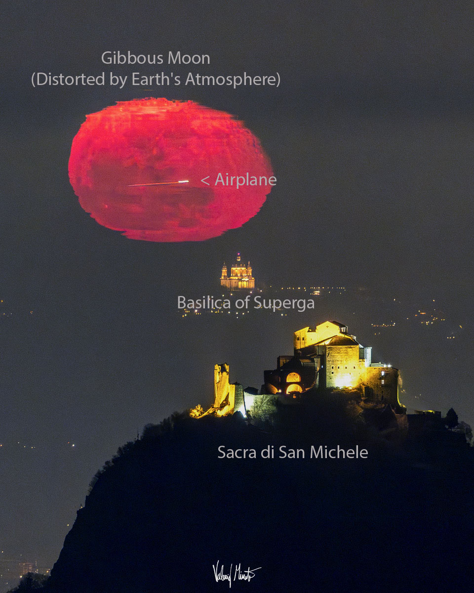 ¿Por qué esta Luna se mira tan inusual? Una razón clave es su vívido color rojo. El color es causado por la desviación de la luz azul por la atmósfera de la Tierra — la misma razón por la que el cielo diurno aparece azul. La Luna también aparece inusualmente distorsionada. Su extraña estructuración es un efecto óptico que surge por las capas en la atmósfera de la Tierra que refracta la luz de manera diferente debido a diferencias repentinas en la temperatura o la presión. Una tercera razón para que la Luna se vea tan inusual es que hay, por casualidad, un avión volando frente a ella. La pintoresca Luna gibosa presentada acá fue captada hace dos semanas por encima de Turín, Italia. Nuestra familiar orbe flotante del cielo fue parte de un inusual alineamiento cuádruple que incluyó a dos estructuras históricas en tierra: la Sacra di San Michele en la colina cercana y la Basílica de Superga justo detrás.